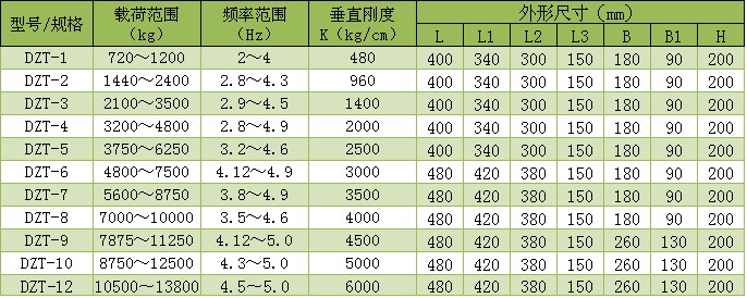 DZT大載荷型阻尼彈簧減振器共有11種規格,單只減振器的載荷自720kg~13800kg,固有頻率在5.1Hz以下,阻尼比為0.04~0.1,能滿足700rpm以上大中型動力設備的減振降噪和儀器儀表的被動減振和實驗室的減振。