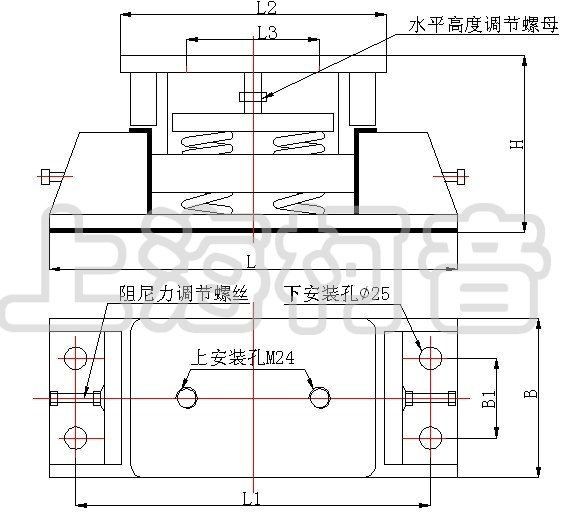 本產品上下表面粘有隔聲防滑橡膠墊。側向有橡膠阻尼塊,可調節阻尼力。上部配有螺栓孔可與設備連接,下部配有基礎連接孔。當減振系統剛度中心線與被減振設備系統重心線偏離,造成減振器靜態變形不一致時,可調節水平高度調節螺母,使減振器高度達到一致。